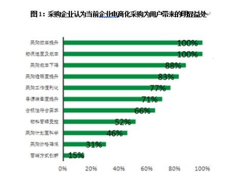 企业对目前电商化采购满意度较高。《报告》显示,当前采购企业对电商化采购的采购效率提升最为满意,满意度高达100%;对服务满意度较高,其中物流配送服务最为满意,满意度也达100%;此外对电商化采购所带来的成本下降、工作便利性、采购合规性等都有较高的认可度。