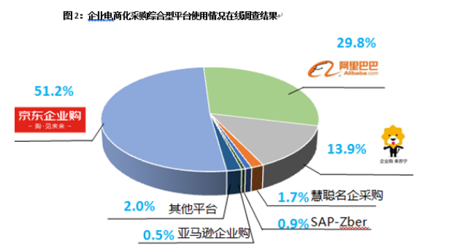 《报告》指出,企业电商化采购综合型平台的业务模式已经基本成熟,进入一个规模增长、技术精进、商业模式加快创新的全方位高速发展新阶段。2018年,企业电商化采购市场综合型平台的交易额已接近2000亿元,年复合增长率83%,高于垂直型平台。《报告》抽样调查显示,企业电商化采购综合型平台中,市场占有率最高的是京东企业购,占整体采购样本的51.2%,其次是阿里企业采购占比29.8%,然后是苏宁企业购,占比13.9%。京东企业购也是客户满意度最高的电商化采购平台。