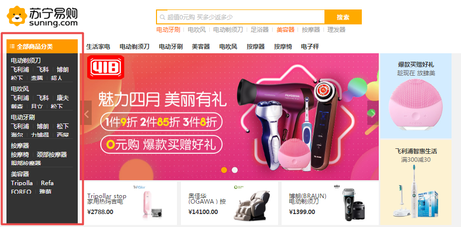 在苏宁易购的生活家电个护健康频道,个护小家电的品类主要有电动剃须刀、电动牙刷、美容器、电吹风、按摩器等产品,涉及品牌包括飞利浦、飞科、博朗、松下、奔腾、戴森、美的、小米,等等。