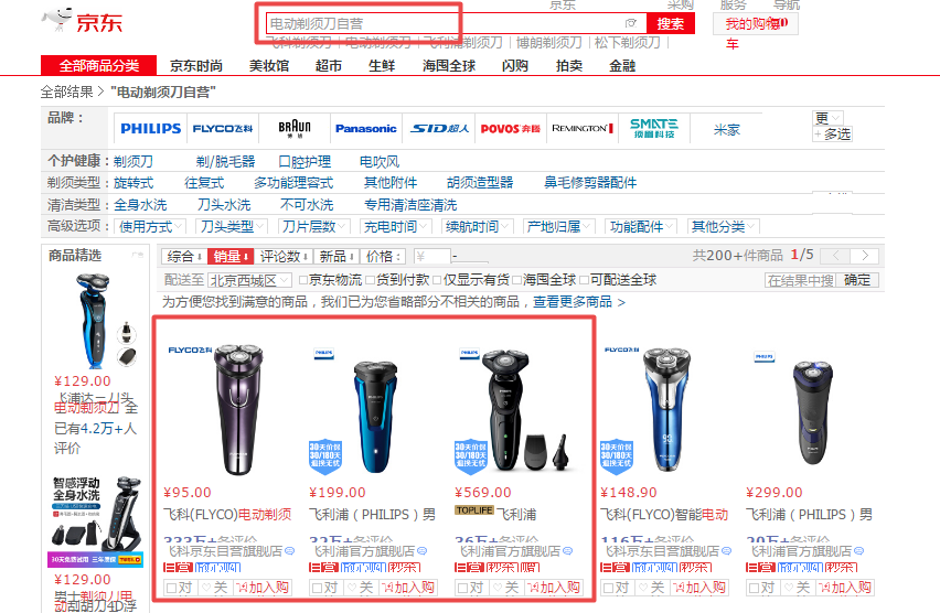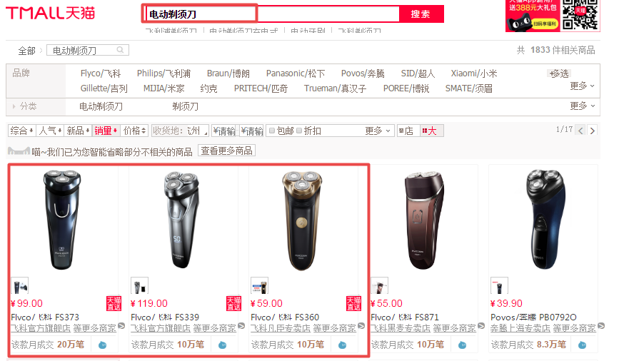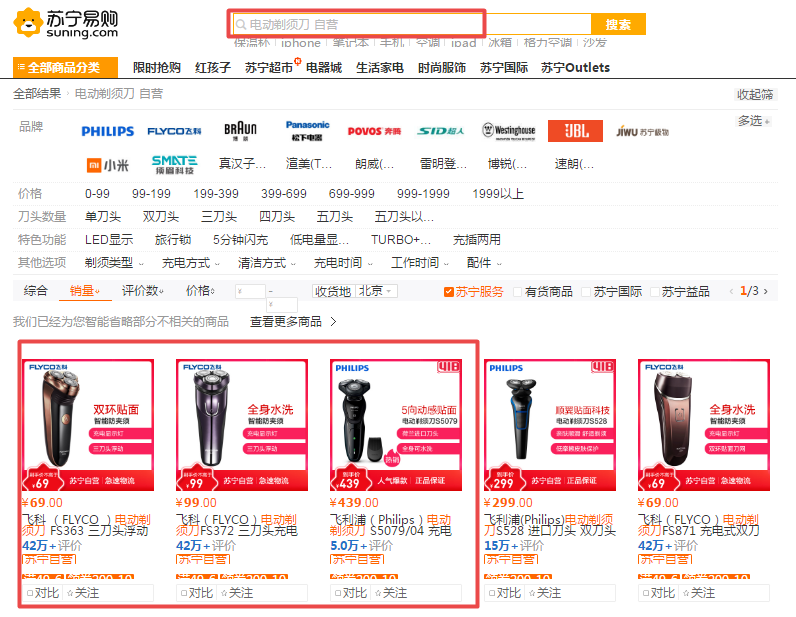 浏览苏宁易购的个护健康频道,记者又搜索了一下“电动剃须刀”这一品类,筛选出“苏宁自营”产品,按照销量从高到低排序,记者发现,销量排名前三的分别是:特价仅69元的飞科(FLYCO)FS363,439元的飞利浦(Philips)S5079/04和99元的飞科(FLYCO)FS372。从整体来看,销量排名靠前的电动剃须刀产品均价大概在二百元左右。而京东自营的“电动剃须刀”销量排名前三的则是95元的飞科(FLYCO)FS372、199元的飞利浦(Philips)S1050/02和148.9元的飞科(FLYCO)FS375,此外,天猫商城销量排名前三的电动剃须刀则均是飞科产品,价位分别是99元、119元和59元。