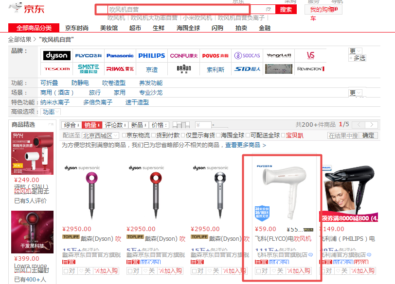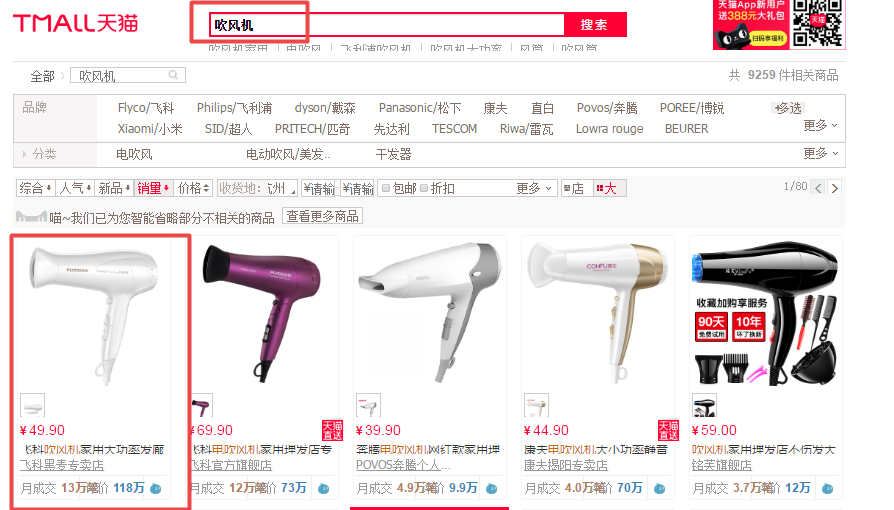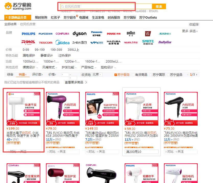 以同样的方式,记者又浏览了一下“吹风机”的情况,结果显示,苏宁自营销量第一的是特价199元的小米米家水离子吹风机,它的特色功能是过热保护、静音设计、漏电保护、小巧便携。千元以上的吹风机,除了戴森(Dyson)的HD01,其他品牌的高价位吹风机均不占太大优势。而京东方面,除去TOPLIFE平台商品,销量排名第一的是49.9元的飞科(FLYCO)FH6232,天猫商城亦如此。