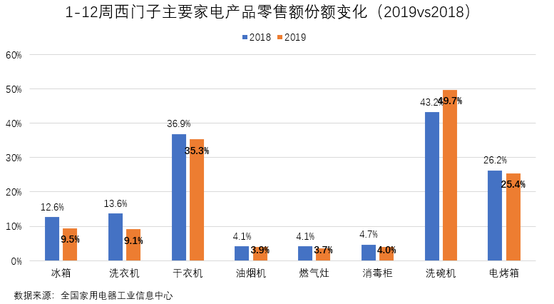 在冰箱产品中,消费者对冰箱产品的主诉功能是保鲜,前期西门子的零度保鲜,真空保鲜确确实实给冰箱行业带来了很大的影响,但是后期的西门子冰箱在产品创新和保鲜技术创新上并没有吸引消费者目光的功能推出,西门子冰箱采用的三循环技术在国产品牌冰箱上也已经广泛使用。在洗衣机产品中,消费者对洗衣机产品的主诉功能已经从洗净衣服,向健康和洗护方向转变,在这一方面不仅有海尔,小天鹅,美的头部品牌加大新品的研发和上市,其他品牌也在发力。以洗干一体滚筒洗衣机为例,2017年洗干一体滚筒的市场份额为20%(滚筒=100%), 2018年洗干一体滚筒的市场份额达到30%。尤其是10KG的洗干一体滚筒,海尔10KG洗干一体滚筒份额达到53.6%(海尔10KG滚筒=100%),小天鹅10KG洗干一体滚筒的份额达到67.8%(小天鹅10KG滚筒=100%),而西门子的大容量洗干一体滚筒参与型号较少,其10KG洗干一体滚筒的份额仅有24.5%(西门子10KG滚筒=100%)。在这一点上还有例证,同样作为外资品牌,松下洗衣机近几年的市场份额在缓慢扩大,它抓住了滚筒的发展趋势,主要容量段跃升到9-10KG,同时在洗干一体产品上也着重发力,其10KG洗干一体滚筒的份额达到64.4%(松下10KG滚筒=100%)。在干衣机和洗碗机市场中,由于国产品牌的参与度还不是太高,西门子尚能保持较大的市场份额,但是随着国产品牌的发力,这两个产品的品牌格局也将会发生变化。