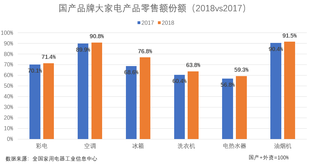 以彩电、空调、冰箱、洗衣机、电热水器、油烟机为代表,全国家用电器工业信息中心数据显示,2018年国产品牌家电的市场份额相对于2017年纷纷走高。