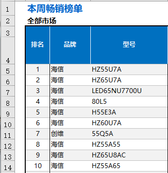 据中怡康最新公布的2019年第14周(4月1日—4月7日)数据,海信电视在第14周市场零售额占有率达到25.3%,零售量占有率22.1%,双双突破20%且排名第一,并包揽了当周电视畅销榜前5名,在前10名中更是包揽9席。