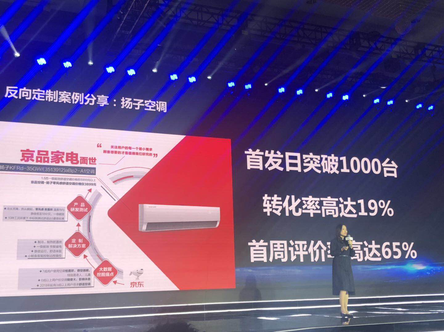 会上,京东家电商企赋能部总监、京品家电负责人卢陆群女士,向与会嘉宾详细介绍了京东C2M反向定制的典型案例----扬子“零风感”空调。