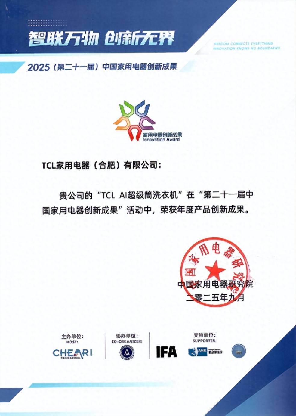 柏林时间2025年9月5日,由中国家用电器研究院主办的“第二十一届(2025)中国家用电器创新成果发布盛典”在德国柏林IFA展上隆重召开。会上,TCL AI超级筒洗衣机一举揽获“年度产品创新”殊荣。这不仅是行业对其洗衣机新品卓越性能与洗护效果的充分肯定,更是对TCL多年来始终坚持自主创新、推动AI技术赋能产业发展的有力见证。