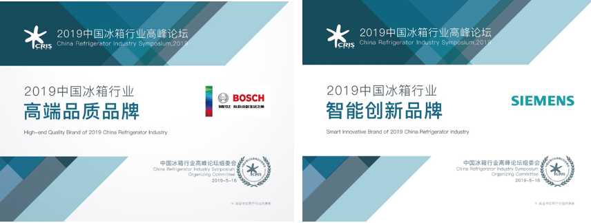 在本次峰会上,博世家电和西门子家电分别荣膺“2019年度中国冰箱行业高端品质品牌”及“2019年度中国冰箱行业智能创新品牌”。产品方面,博世·维他鲜动力多门冰箱大师版KFN96PX91C 荣获“2019中国冰箱行业健康保鲜之星”,西门子云食管家冰箱 KA92NP49TI 摘得“2019中国冰箱行业智能创新产品”。线上产品奖则由西门子智感零度中字门冰箱KF86NA296C 和博世·维他鲜动力多门冰箱 KMF49S66TI双双斩获。