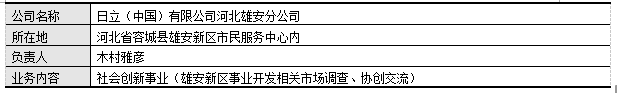 日立(中国))为加速在中国开展智慧城市事业,在中国河北省雄安新区设立“日立(中国)有限公司河北雄安分公司”,力图强化市场动向调查及协创交流。目前分公司已正式开始营业。