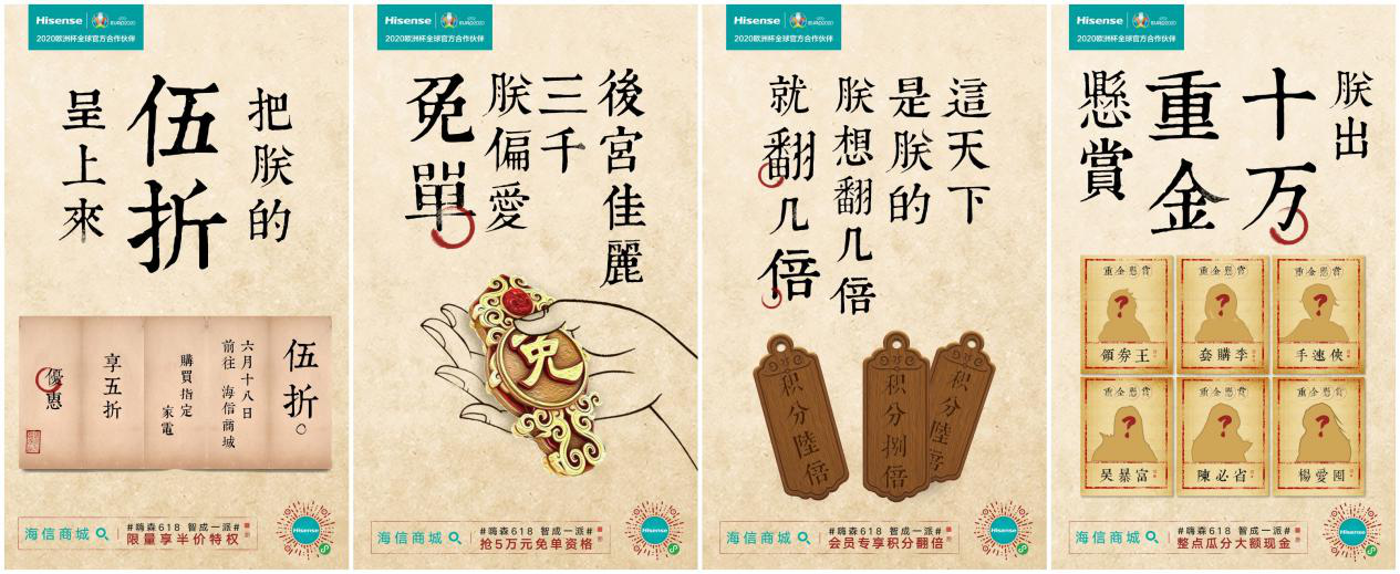 与智能、科技感的产品调性相匹配,海信选择用时尚的国潮风格制作促销海报。向消费者传达海信商城瓜分现金、部分商品享5折、限量免单、积分翻倍等优惠信息的同时,海信秀出了50年经典品牌专属的朝气和活力,充分体现了“品牌年轻化”的思路。