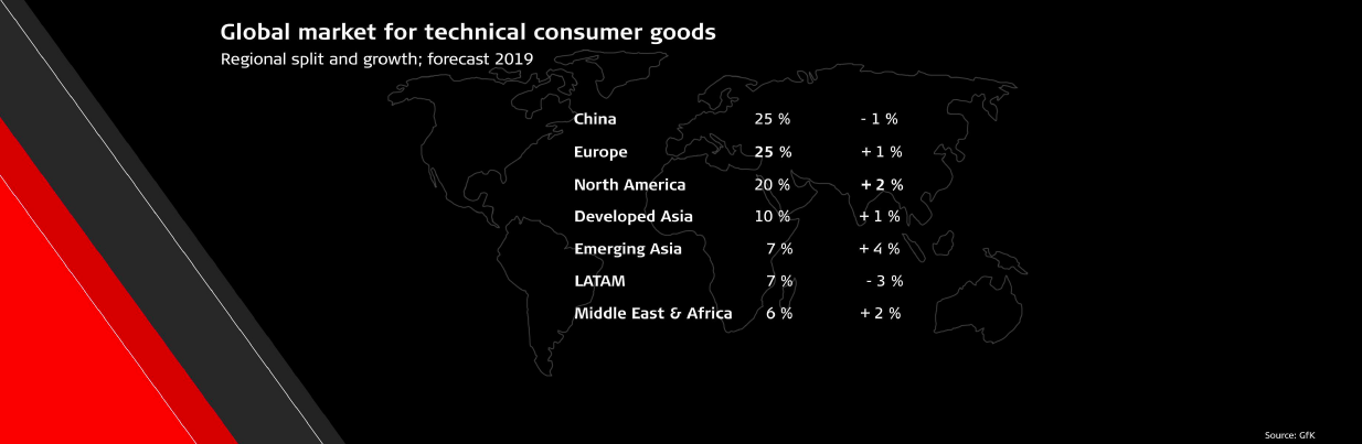 同时,细分数据显示,2019年消费电子市场规模为7790亿欧元,同比持平;家电市场规模将达到2730亿欧元,同比增长4%。同时,中国、欧洲、北美三大市场的占比分别可以达到25%、25%和20%,中国市场已经成为与欧洲市场并列第一的单一市场,未来潜力巨大。