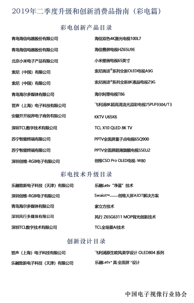 中国电视工业的发展离不开政策对市场宏观环境的准确认知,也离不开行业对电视产业发展现状格局的准确把握,更离不开电视企业的努力和创新,为此中国电子视像行业协会为积极推动行业技术升级和创新发展的企业颁发彩电创新产品、彩电技术升级、创新设计三大消费品指南,发布《2019年二季度升级和创新消费品指南(彩电篇)》,鼓励电视企业不断创新发展,为行业发展注入更多新的动力!获得此殊荣的各个品牌有: