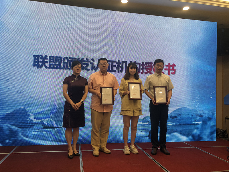 威凯、通标和中环联合已经向金质共享认证联盟申请开展“真丝洗”产品认证并获批准,此次会议邀请了金质共享认证联盟秘书长、中标能效科技(北京)有限公司总经理张少君女士为三家授权认证机构颁发授权书。