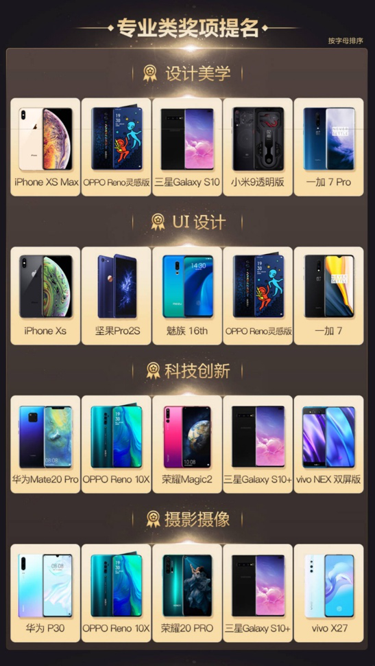 在去年的金机奖评选中,国产手机品牌已经表现得非常亮眼。在本年度金机奖的提名评选过程中,国产手机仍然占据领跑优势,上榜率超80%。其中,P系列、mate系列和nova系列全面开花的华为和手握iPhone XS 系列王牌的苹果均将6个提名奖项收入囊中,成为本届金机奖提名评选阶段的最大赢家。