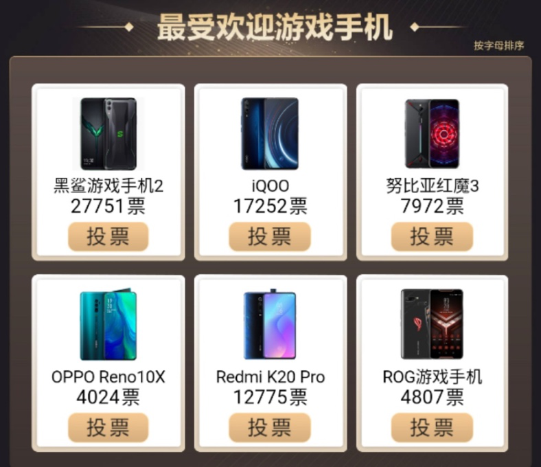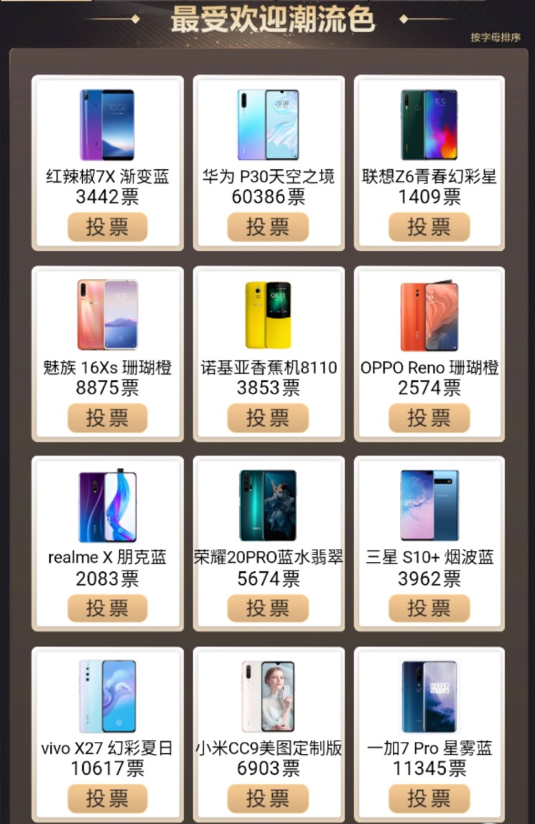 除了已经公布提名结果的三大类奖项之外,2019京东手机金机奖还设置了大众评选类奖项。截至今日,得票最多的两款手机分别是参选“最受欢迎潮流色”的HUAWEI P30(天空之境)和参选“最受欢迎游戏手机”的黑鲨游戏手机2。