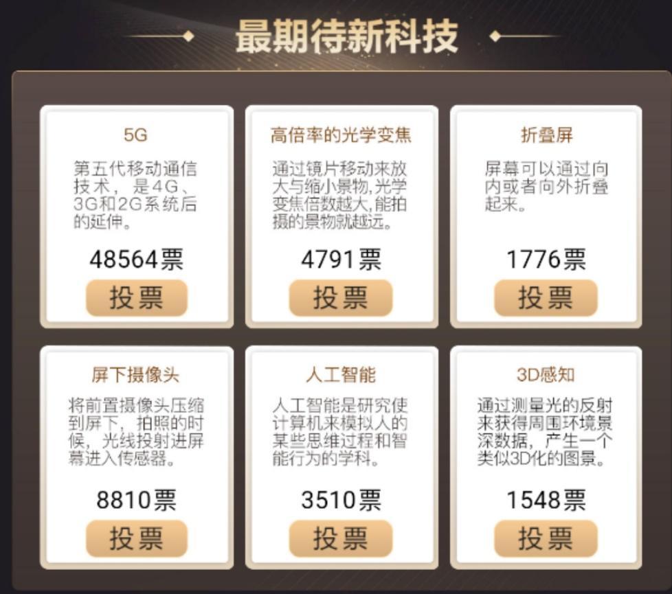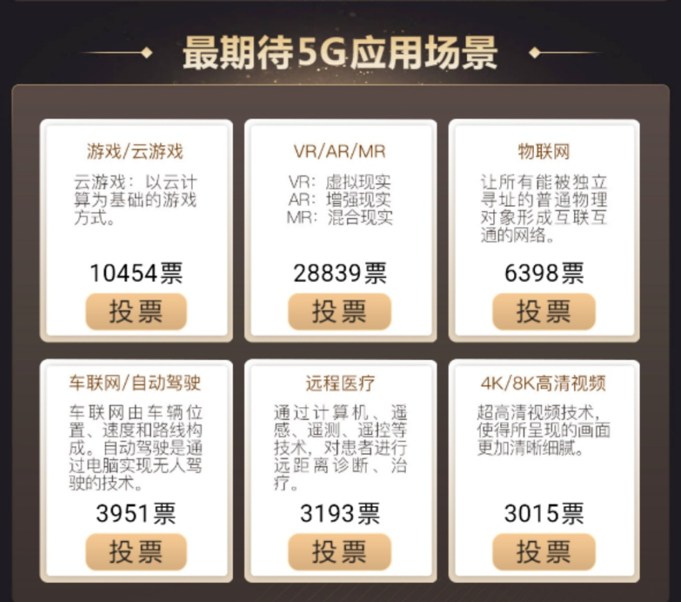 从目前的投票结果来看,“5G移动通信技术”以近5万票的压倒性优势领先“最期待新科”奖项投票,而消费者最期待的5G应用场景则是VR(虚拟现实)、AR(增强现实)和MR(混合现实),该选项目前已获得近3万票数。不难看出,这届消费者更青睐有科技感和未来感的5G手机新品,在4G手机现有研发技术基础上进行的小幅度技术革新已经不能满足消费者对5G手机的期待和想象。