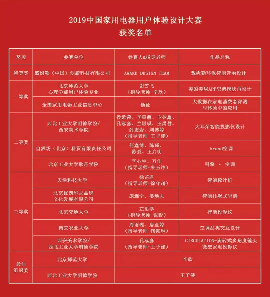 此次“2019中国家用电器用户体验设计大赛”历时半年,参赛选手涵盖知名企业、设计工作者、高校设计专业师生、设计爱好者等等。最终,评审团队从325件参赛作品中评选出了特等奖1名、一等奖2名、二等奖3名、三等奖5名、最佳组织奖2名,获奖选手除了能够获得由主办方颁发的获奖证书外,在论坛结束后,其获奖作品也会陆续在中国家用电器研究院的诸多媒体渠道及业界其它媒体平台展示发布。