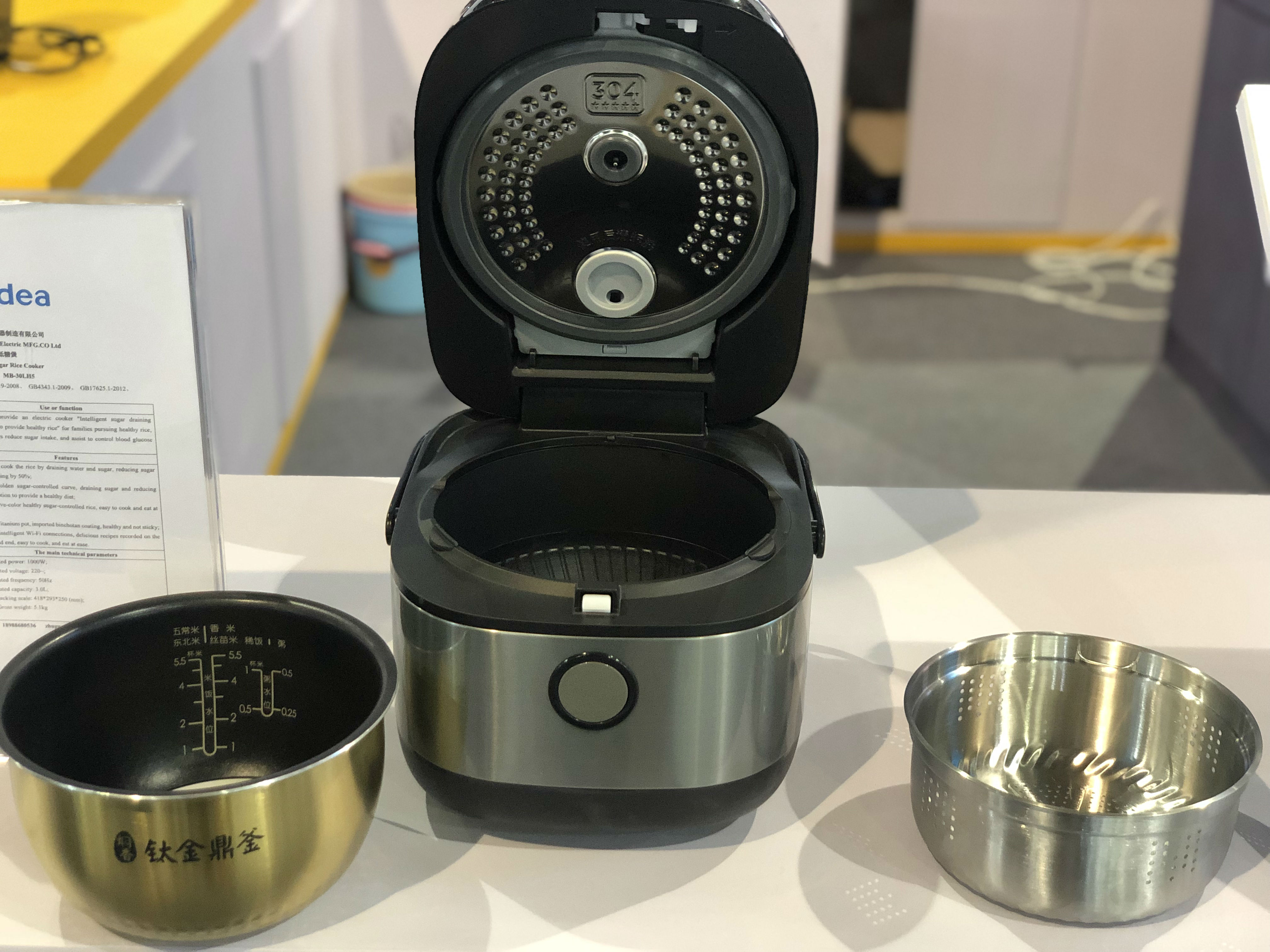 据现场的工作人员介绍,美的的低糖电饭煲,其技术工艺原理主要类似于沥米饭蒸煮工艺,是通过“先煮后蒸、米水分离”以降低其还原糖的含量。工作人员告诉记者,美的推出的这款低糖电饭煲通过澎湃沥煮,百孔沥糖,蒸煮过程中30次循环冲刷,持续降低米饭还原糖含量。根据美的实验室数据显示,与普通米饭相比,使用低糖饭煲制作的米饭,米饭还原糖降低约50%,米饭抗性淀粉提升约23%。同时,内置的焖香钛金鼎釜,进口备长炭涂层,健康不粘,让米饭更加香软可口。